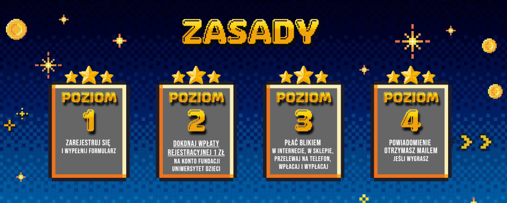 Dokończeniem procesu rejestracyjnego jest zrealizowanie transakcji rejestracyjnej BLIK na rzecz Fundacji Uniwersytet Dzieci w kwocie 1 zł.